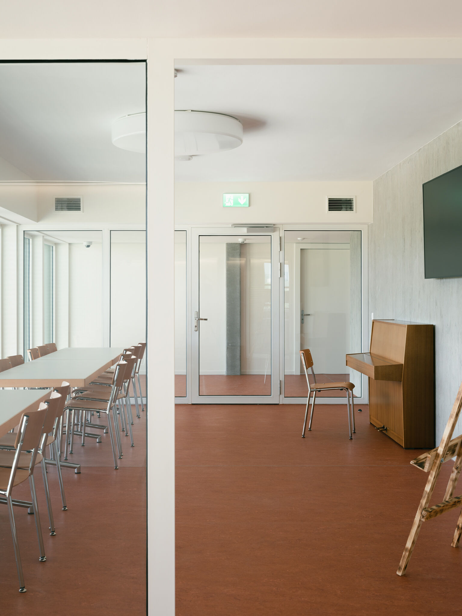 Planned for a parcel that lies adjacent to the premises of Geneva Airport in the municipality of Le Grand-Saconnex are two new buildings, one for the international police of the Canton of Geneva, the other an asylum centre operated by the Swiss Confederation. A shared pedestal level, which serves mainly to accommodate the car park, forms the base for both buildings. This level skilfully exploits the topography to form an expansive platform that lies on the level of the access road and serves as an arrivals area, disperses the stream of visitors, and can also serve as a space of encounter.