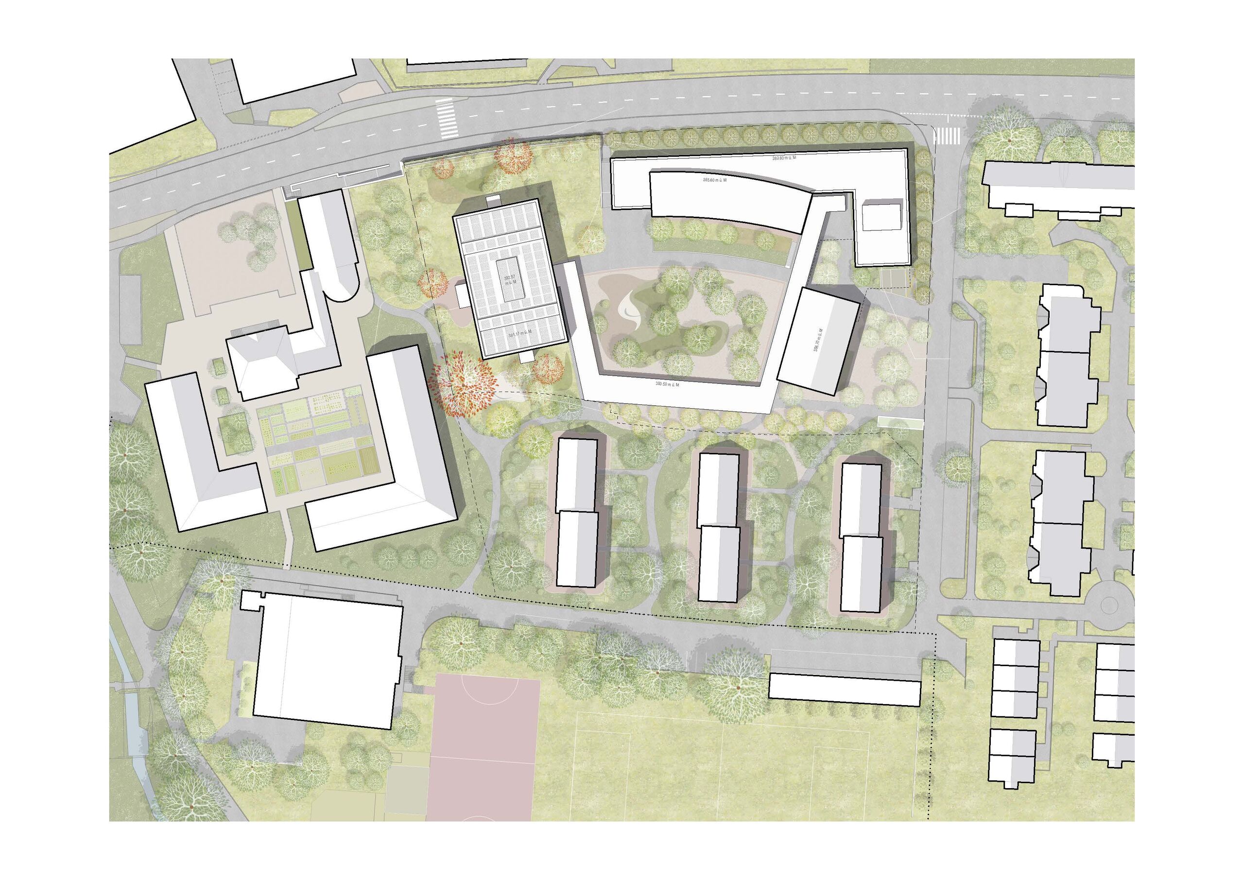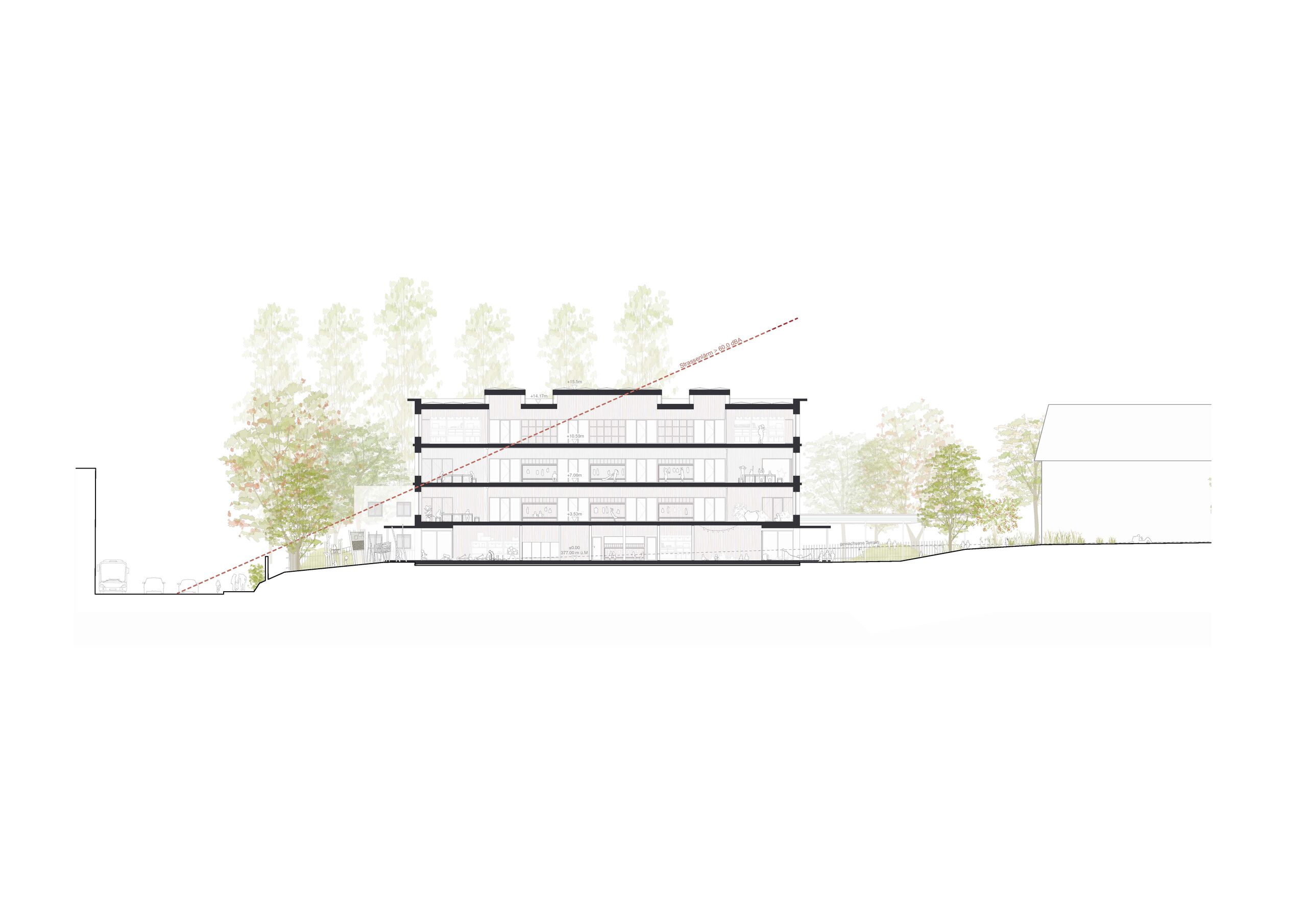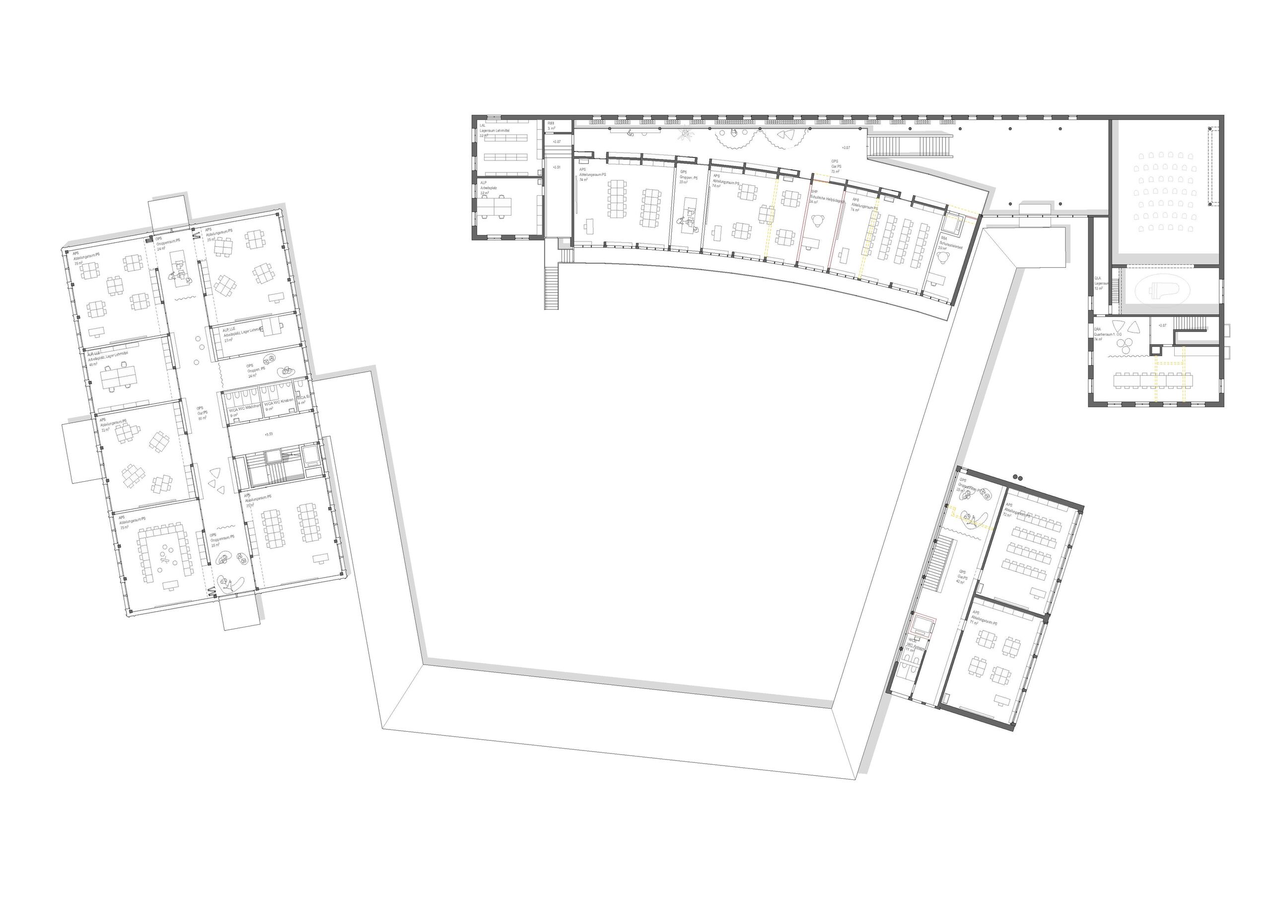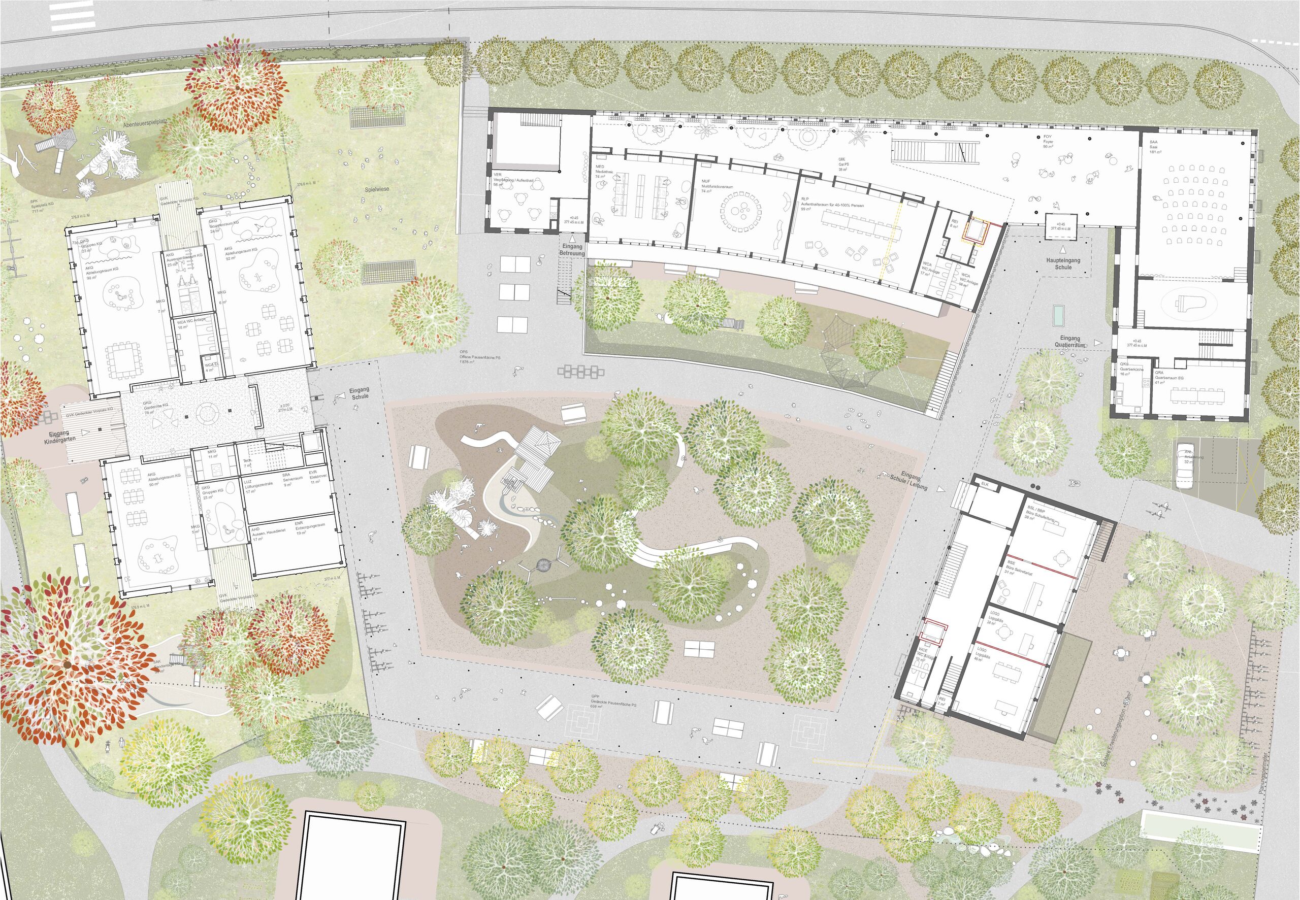 The project emphasizes a respectful approach to the existing buildings and sustainable, minimal interventions. The “New Schoolhouse” remains the main structure, complemented by a compact extension built with a modular timber system. A unifying roof creates a central courtyard as a place for learning and community. The layout includes kindergarten on the ground floor, primary school clusters above, and specialized rooms on the top floor. Flexible spaces support diverse educational concepts. Sustainability is ensured through timber, clay, and foam glass construction, avoiding concrete, using durable materials, and reducing energy use. The result is a future-oriented, efficient, and healthy school environment.