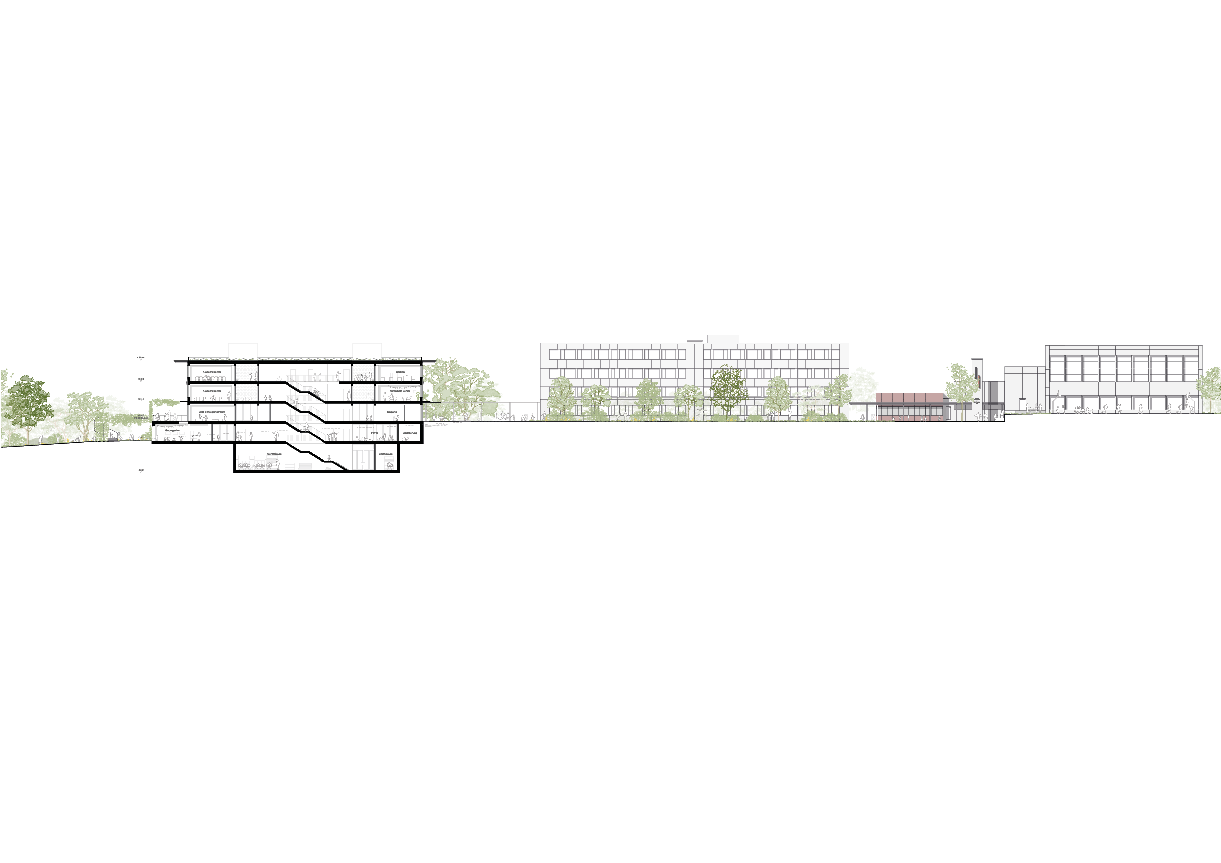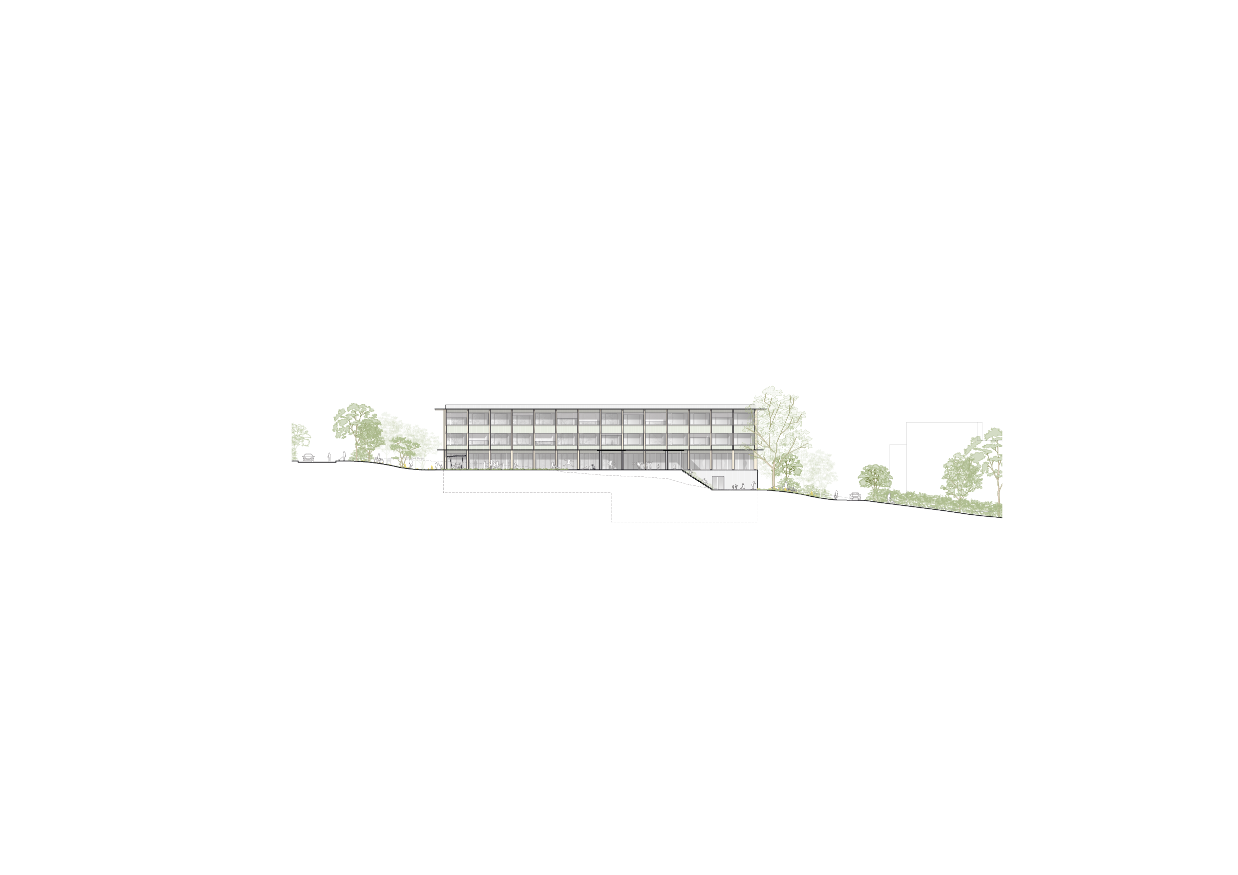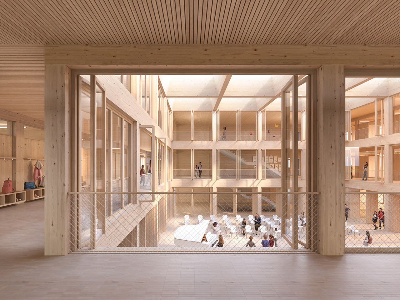 The extension building completes the three existing school structures and creates a large continuous green area in the east. A setback strengthens the pedestrian connection, while a new plaza is formed in the west. The school gains two equivalent entrances. Beneath the connecting roof are the main entrance, the assembly hall, and access to the after-school care, which is fully organized on the ground floor. The upper floors contain classrooms, administration, workshop rooms, and music. The gymnasium and kindergarten are located in the base level with direct outdoor access. Diverse outdoor spaces offer areas for play, learning, and retreat. The compact timber building uses photovoltaics, green roofs, clear building systems, and prefabricated elements for sustainability and efficiency.