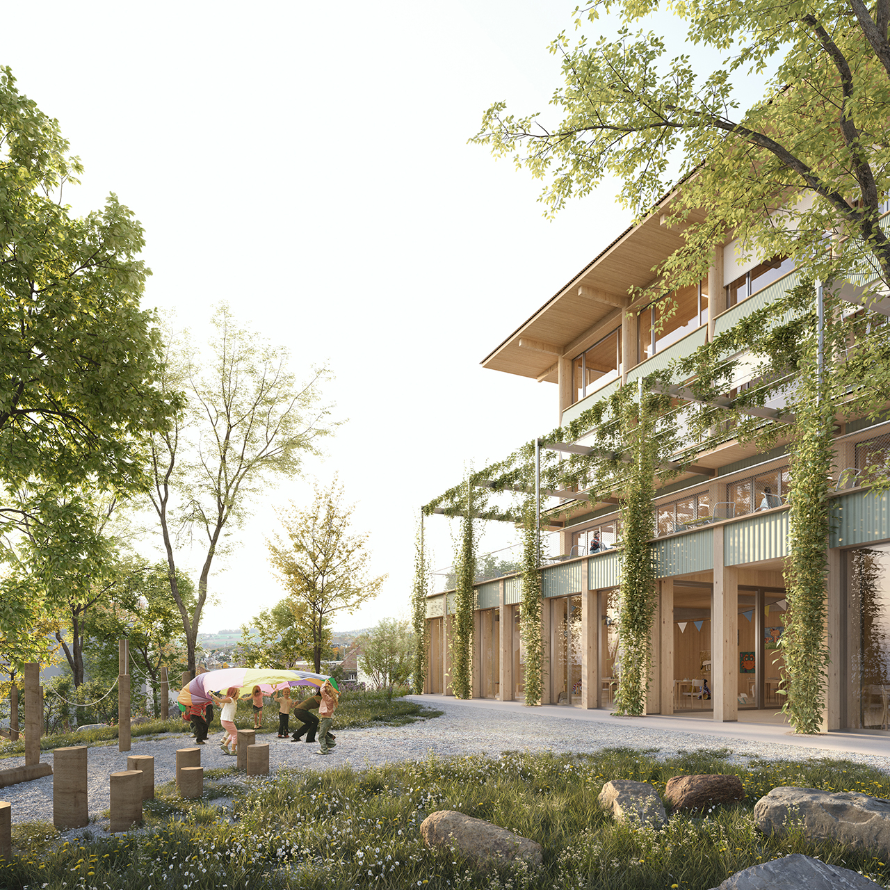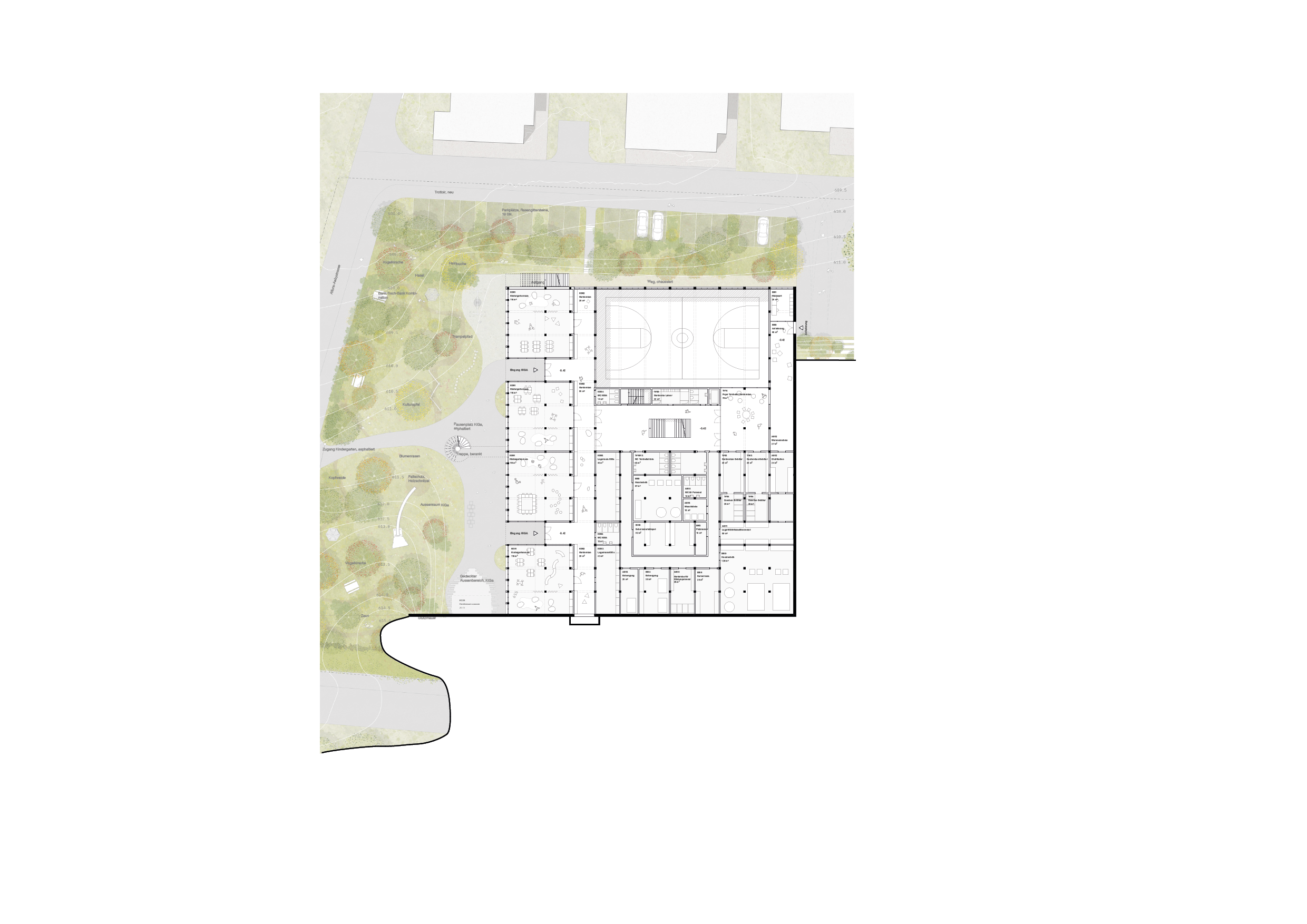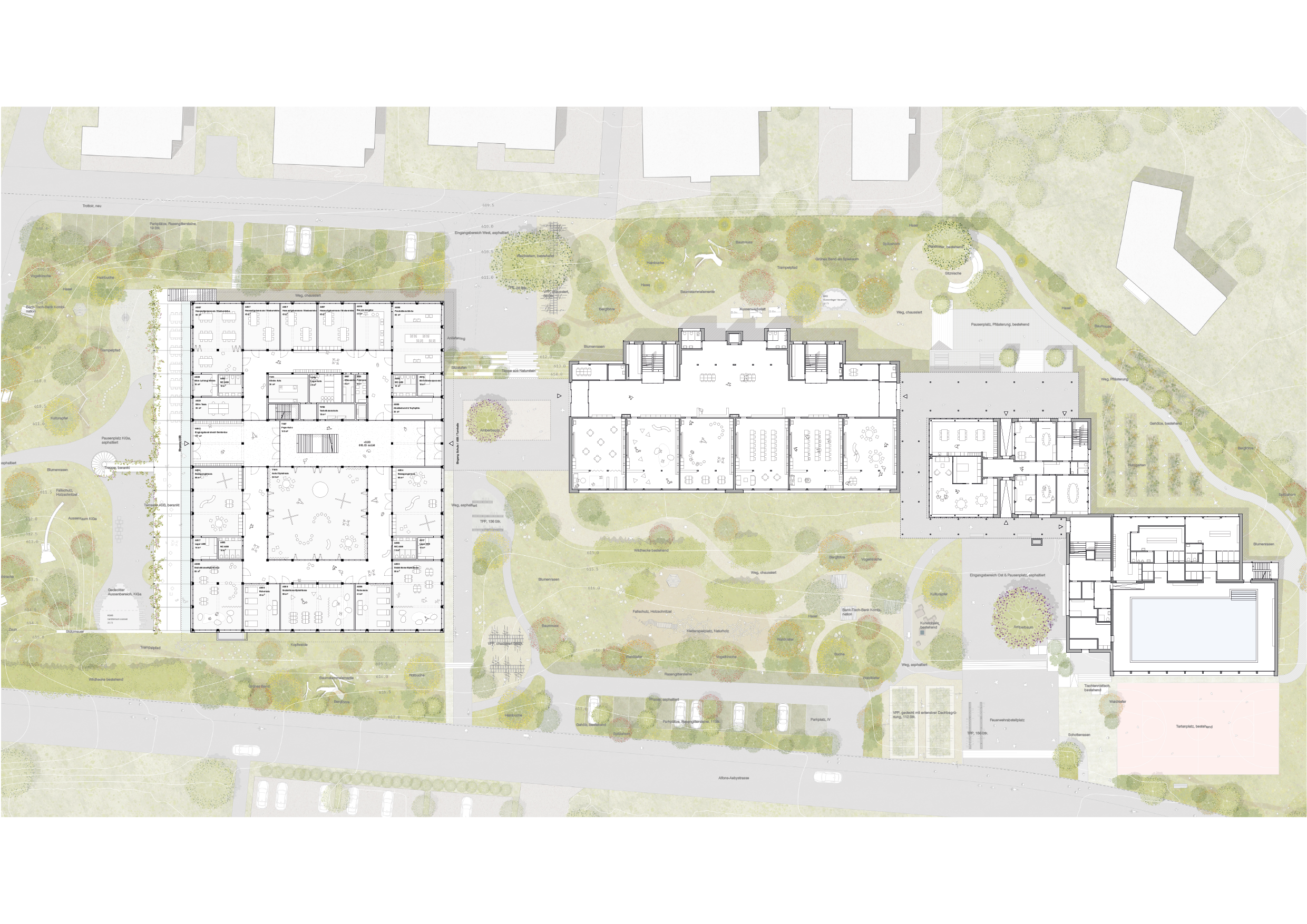 The extension building completes the three existing school structures and creates a large continuous green area in the east. A setback strengthens the pedestrian connection, while a new plaza is formed in the west. The school gains two equivalent entrances. Beneath the connecting roof are the main entrance, the assembly hall, and access to the after-school care, which is fully organized on the ground floor. The upper floors contain classrooms, administration, workshop rooms, and music. The gymnasium and kindergarten are located in the base level with direct outdoor access. Diverse outdoor spaces offer areas for play, learning, and retreat. The compact timber building uses photovoltaics, green roofs, clear building systems, and prefabricated elements for sustainability and efficiency.